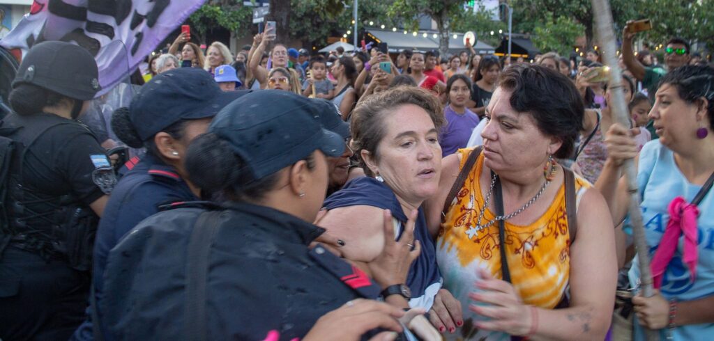 La policía arrastró salvajemente a Mónica Cunchila, mamá de Iara Ruada, víctima de femicidio en el 2020. El femicidio de esta joven de 16 años marcó un antes y un después en la provincia y obligó al gobierno a declarar la emergencia en violencia de género. Además, agredieron a la abogada Mariana Vargas y a la referente de la Red por el Derecho a la Identidad de Abuelas de Plaza de Mayo, Nora Ferreyra, ex-presa política del Plan Cóndor.