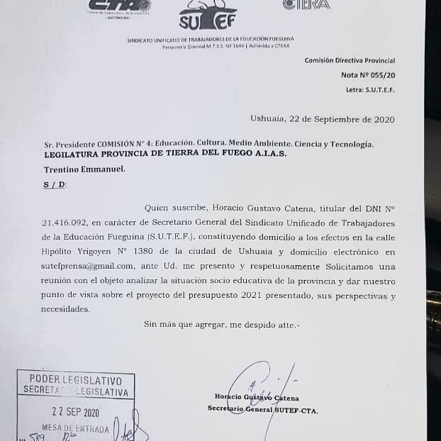Ante la dilación de la convocatoria a Mesa Técnica para continuar con las negociaciones, el SUTEF realizó el pedido formal mediante nota al Secretario de Educación señalando el “tiempo trascurrido desde la entrega de nuestra propuesta”.
