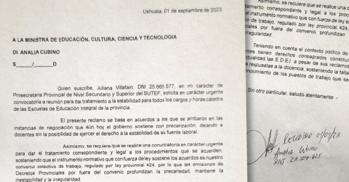 En el día de la fecha, viernes 1 de septiembre, SUTEF presentó en la Mesa Diálogo una nota a la Ministra de Educación, Analía Cubino, solicitando de carácter urgente una reunión para dar tratamiento correspondiente y legal a los procedimientos en las Escuelas de Educación Integral de la provincia (EDEI), remarcando que el instrumento normativo que con fuerza de ley sostiene los acuerdos es nuestro Convenio Colectivo de Trabajo (CCT) entendiendo que las emisiones de decretos provinciales por fuera del convenio profundizan la precariedad, manteniendo la inestabilidad y la irregularidad.