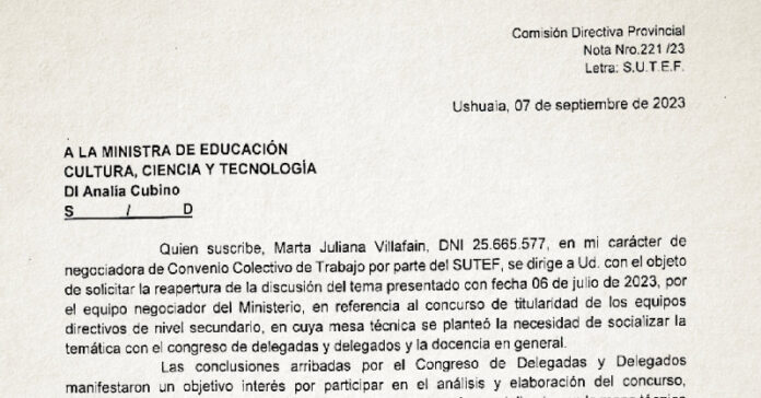 Por esto, el día 07 de septiembre de 2023, se solicitó convocatoria a la brevedad para dar tratamiento al Concurso para Titularizar los cargos directivos del Nivel Secundario, en función del Proyecto presentado por el Ministerio -con fecha 06 de julio- denominado “Concurso a cubrir los cargos de Directores y Vicedirectores del Nivel Secundario”, con el fin de socializar la agenda dispuesta por Delegadas y Delegados permitiendo la construcción colectiva de un concurso que involucra el ejercicio de un derecho pleno, justo y de reconocimiento legítimo de toda la docencia del nivel.