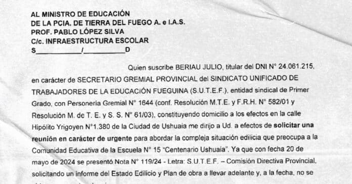 El pasado 6 de junio, SUTEF solicitó una reunión al ministro de Educación, Pablo López Silva, para abordar la compleja situación edilicia de la Escuela Nro. 15 “Centenario Ushuaia”.