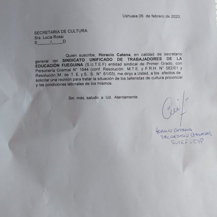 Mediante nota formalmente presentada, el sindicato docente solicitó una reunión con la Secretaria de Cultura de la Provincia, Lucía Rossi, para tratar la situación de los talleristas de cultura.