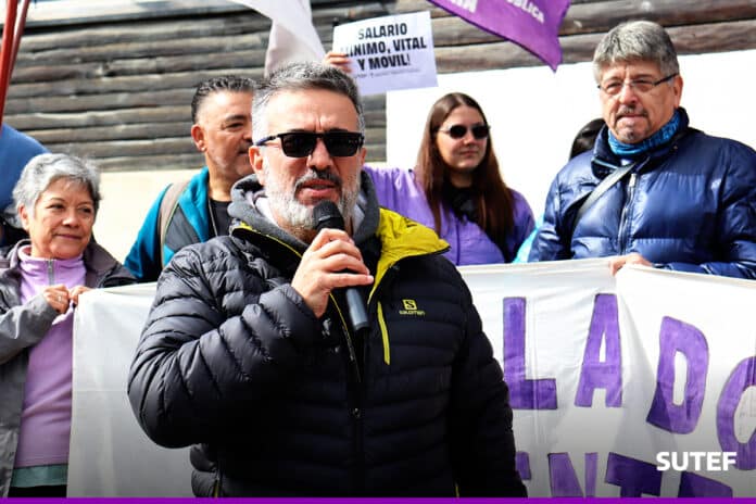 Frente a Casa de Gobierno, este lunes 24 de febrero, el secretario general de SUTEF llamó a la docencia a profundizar la unidad de las instituciones educativas y a movilizarse para la apertura de las sesiones legislativas que se realizará este sábado 1 de marzo en la ciudad de Ushuaia.