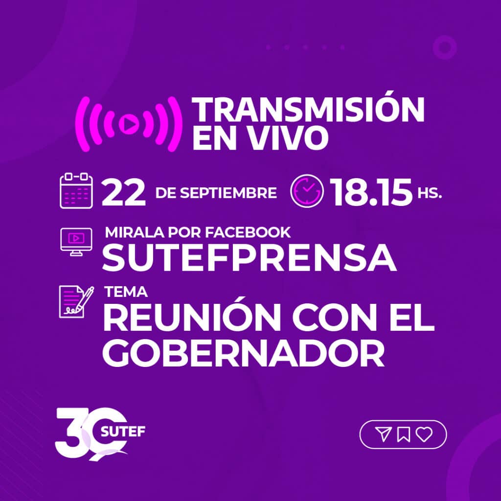 SalarioConvocatoriasTransmisión en vivo con nuestro Secretario General Transmisión en vivo con nuestro Secretario General publicado el 22 septiembre, 2023 FacebookTwitterPinterestWhatsAppEmailImpresiónTelegramCopy URL A las 18.15 hs. estaremos realizando una transmisión en vivo con nuestro Secretario General, Horacio Catena, en la que brindará información de la reunión con el Gobernador de la Provincia. SUTEF 30 años en defensa de la Educación Pública y Popular Últimos artículos Junta de Clasificación y Disciplina Nivel Inicial - Primario - Modalidades - Gabinete Cronograma y requisitos del Acto de Titularidad 👆 ¡Deslizá y mirá el cronograma de tu ciudad! Las vocales de SUTEF de la... 15 diciembre, 2025 Noticias Se conformó el Frente Nacional Democrático por la Educación Pública En un contexto de crisis educativa y laboral, se llevó a cabo el primer... 15 diciembre, 2025 Más publicaciones Convocatorias SUTEF fue convocado a Mesa Paritaria Salarial el 14/08 En el día de la fecha, miércoles 13 de agosto, la Secretaria de Coordinación... 13 agosto, 2025 Convocatorias Clases Abiertas por el Salario Mínimo, Vital y Móvil de la docencia fueguina Desde el Sindicato Unificado de las Trabajadoras y Trabajadores de la Educación Fueguina (SUTEF)... 24 junio, 2025 Convocatorias SMVM: congreso provincial para delegadas/os formativo ➡️ SUTEF convoca a las delegadas y delegados a congreso provincial formativo sobre "Salario... 29 abril, 2025