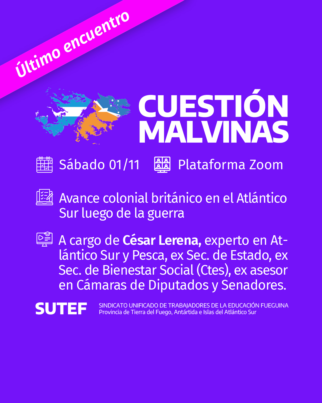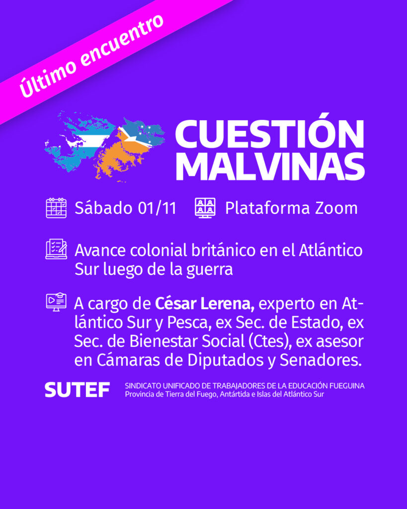 🗓️ El próximo sábado 1 de noviembre se llevará adelante el último encuentro de «Cuestión Malvinas – Programa de capacitación docente» organizado por SUTEF.