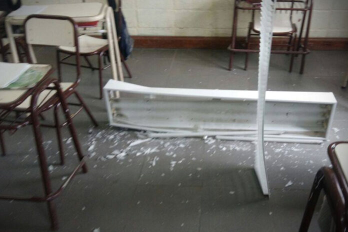 Mientras estaban en clase en un aula, uno de los plafones de iluminación se desprendió del techo y cayó sobre los estudiantes. Una de las alumnas quedó fuertemente golpeada. Por suerte no está grave, pero pudo haber sido una tragedia.