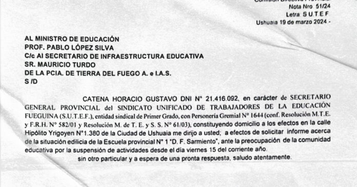 En el día de la fecha, martes 19 de marzo, el Sindicato Unificado de Trabajadoras y Trabajadores de la Educación Fueguina (SUTEF) solicitó un informe de la situación edilicia de la Escuela Provincial Nro. 1 «D.F. Sarmiento» al Ministro de Educación, Pablo López Silva, y al Secretario de Infraestructura Educativa, Mauricio Turdo.